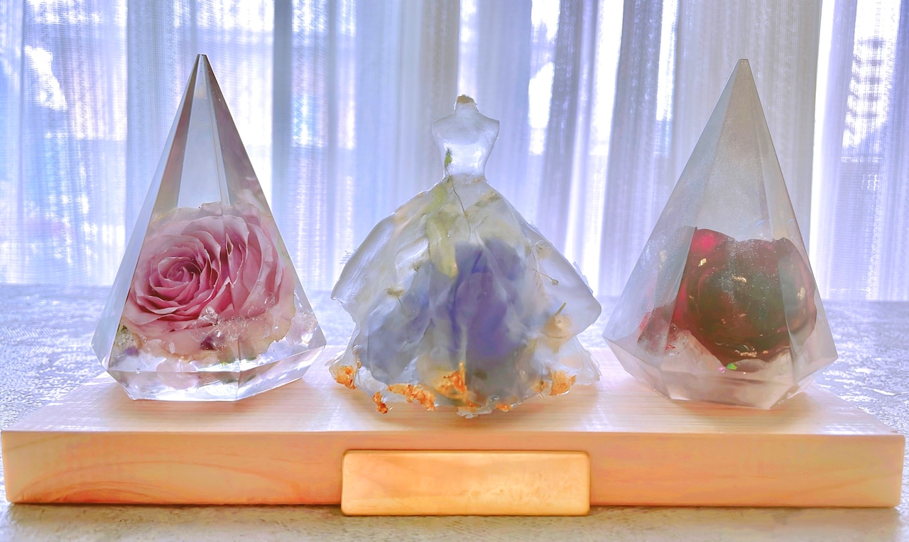 ドレス型、リングホルダー2つ、真鍮プレート付き土台のセットです