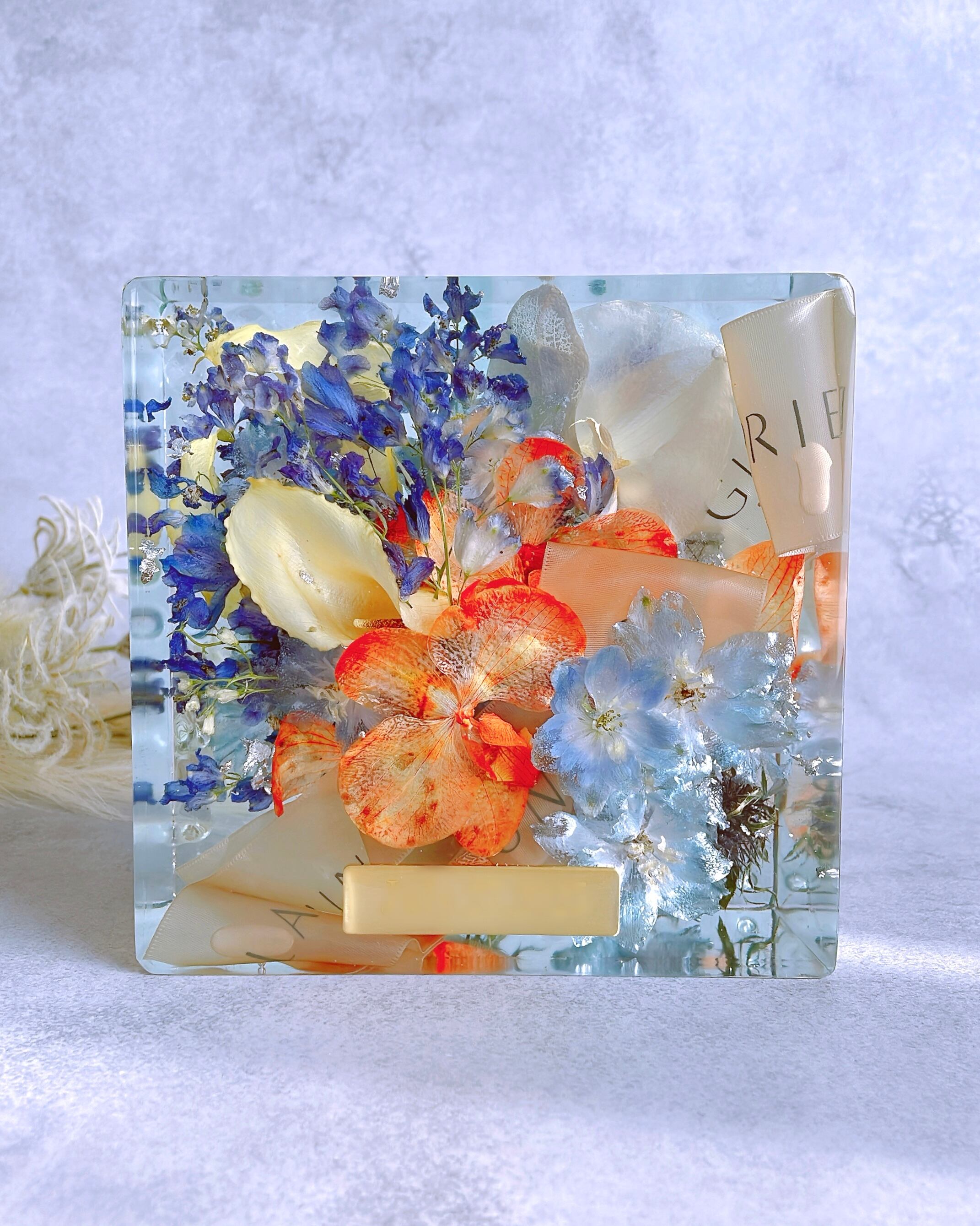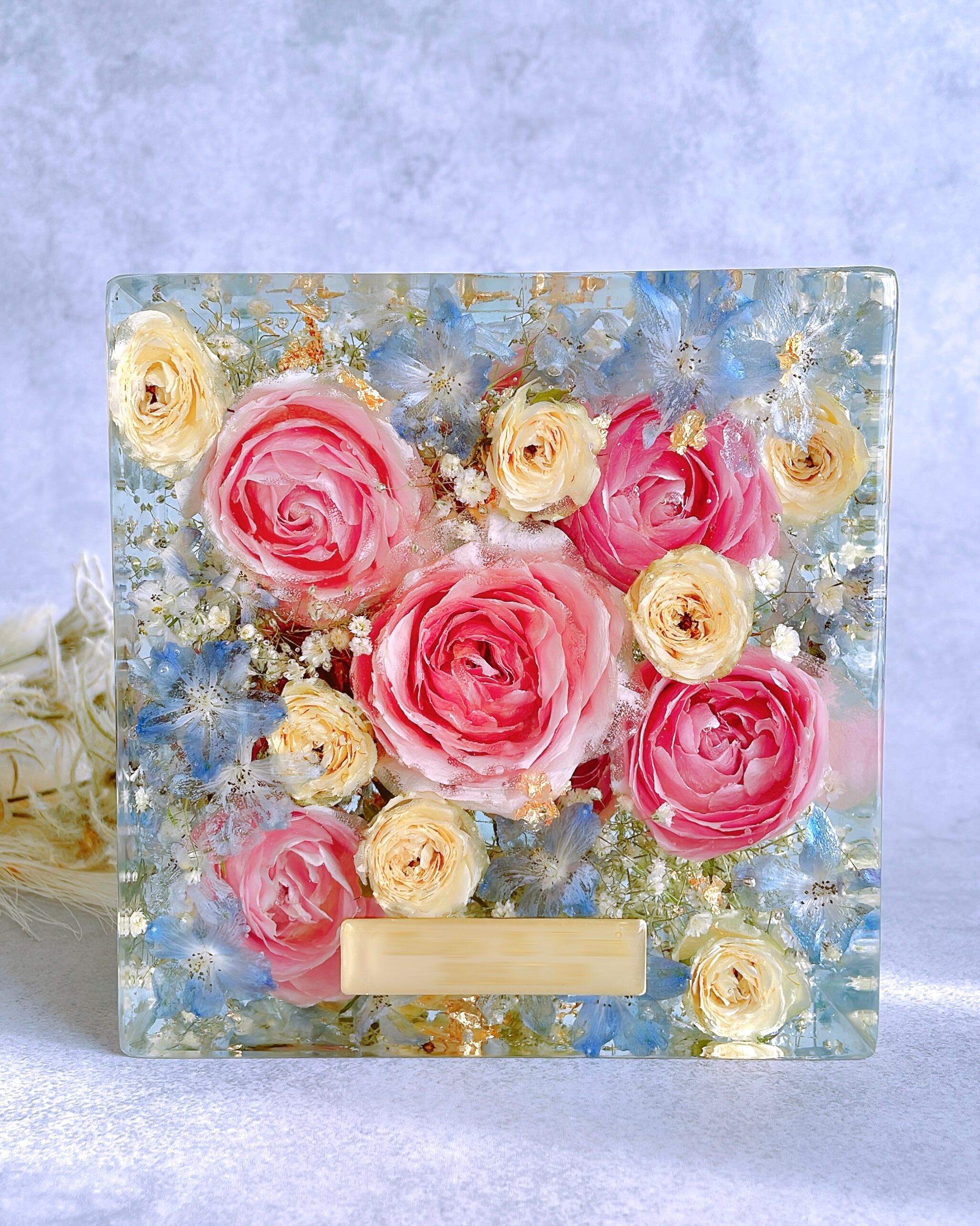 ♦︎経年劣化でレジンやお花がゆっくり薄くなります。直射日光や高温多湿を避けて飾っていただくことで永く美しい状態を保てます